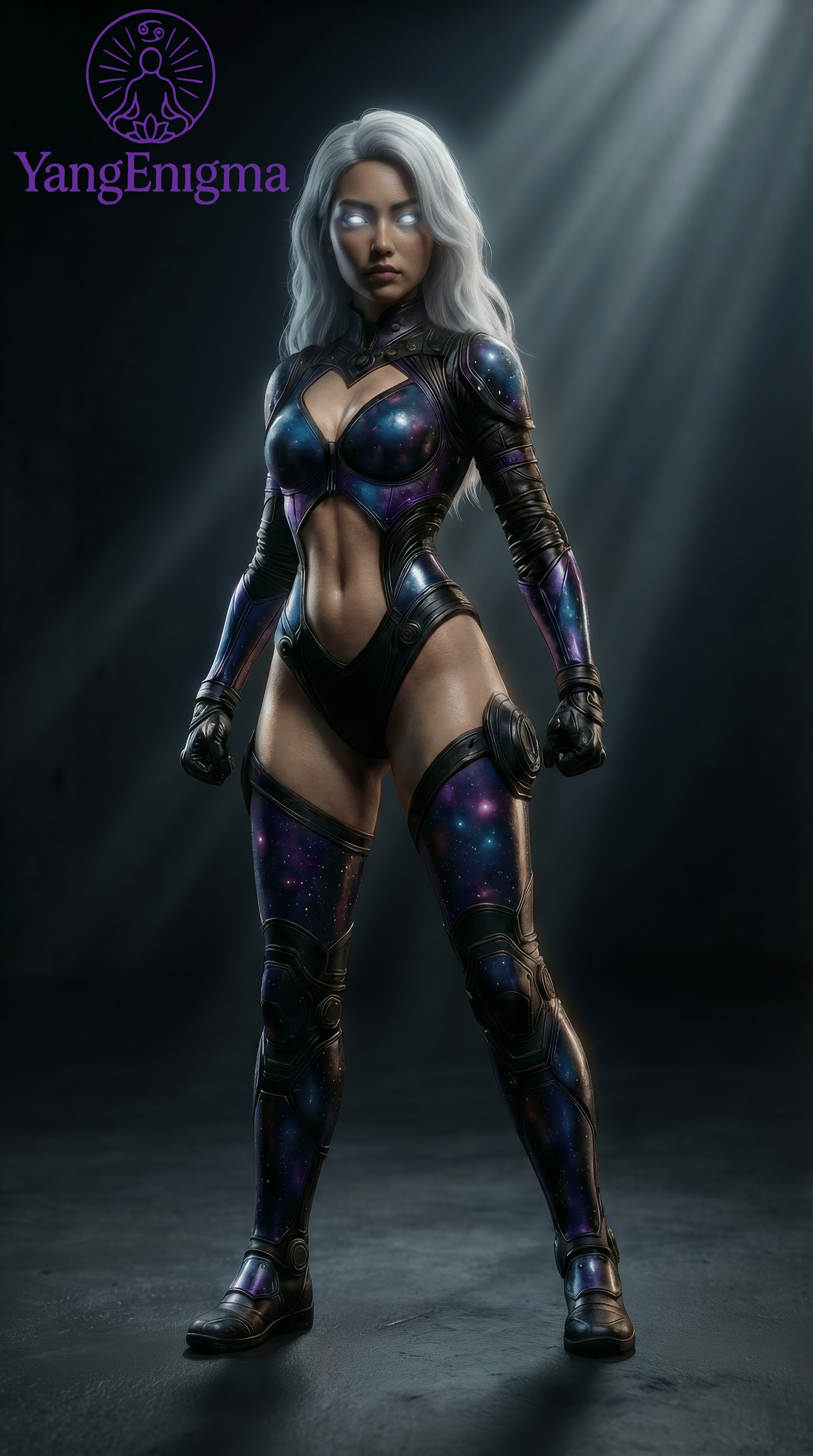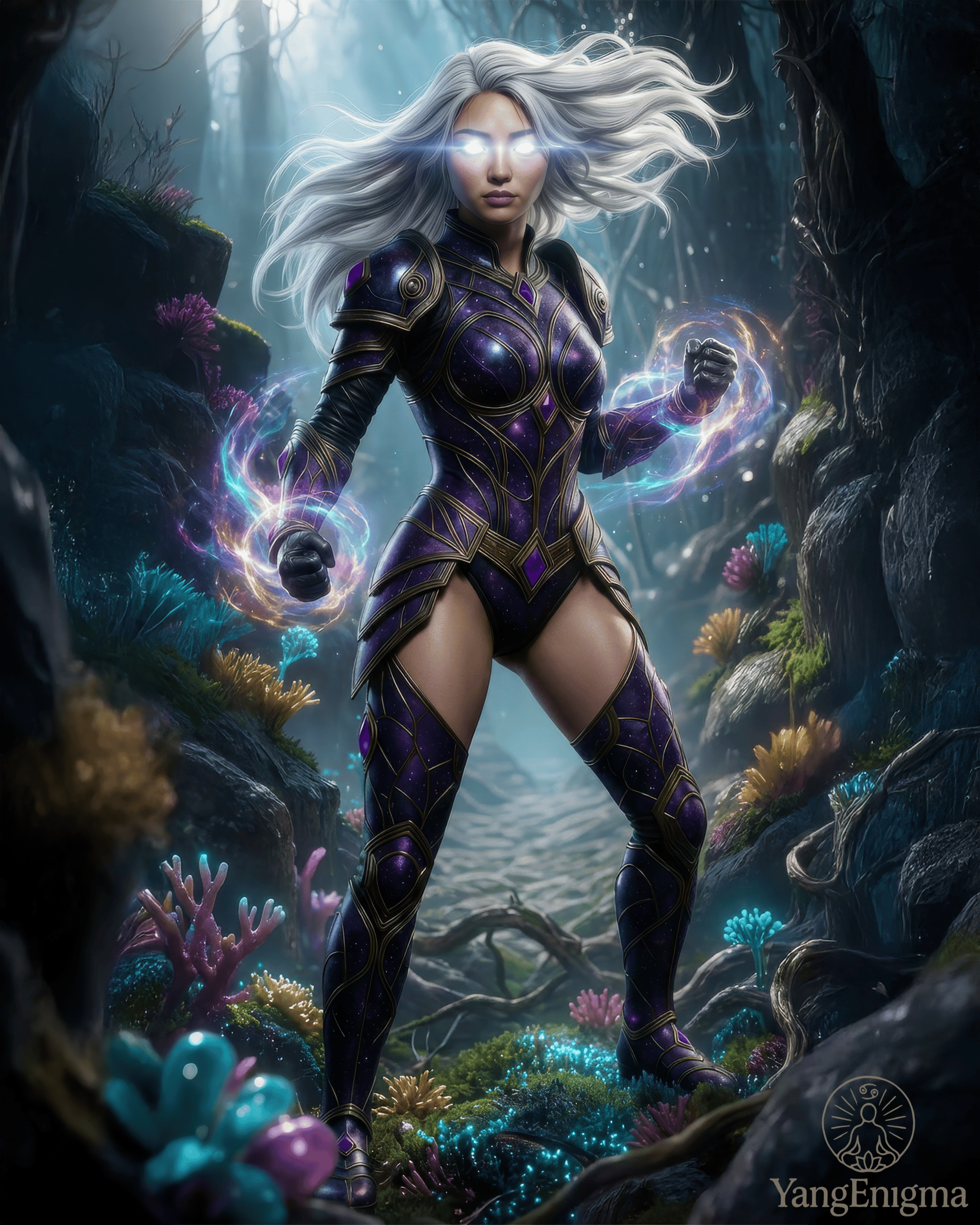 Her armor reflects this duality. In its relaxed state, it is dormant, contained, responsive but restrained. When empowered, it reshapes itself, amplifying her strength, perception, and survivability. This transformation does not originate from emotion alone. It responds to alignment with a passive signal threaded through the environment itself.